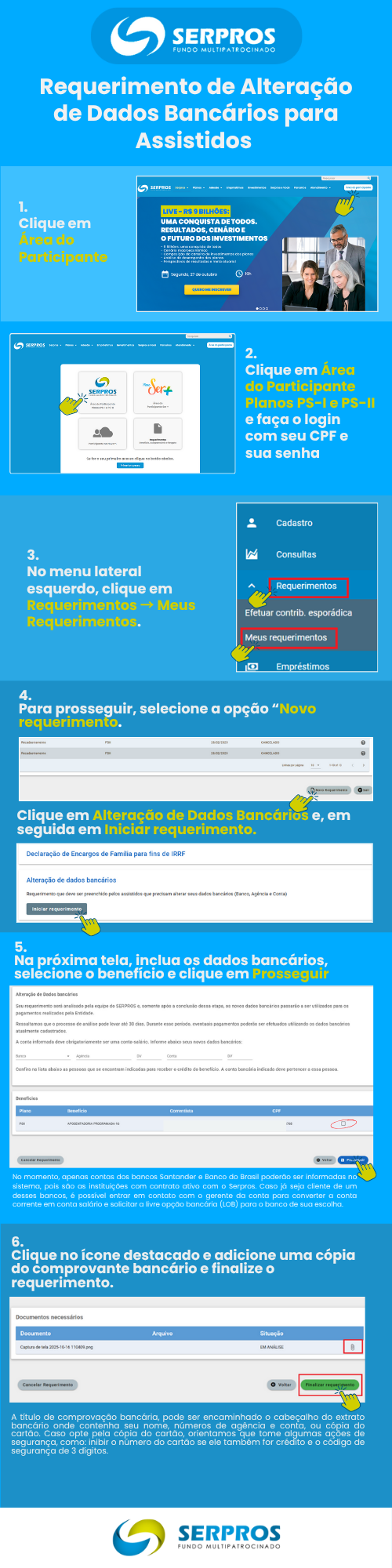 O requerimento de alteração de dados bancários para os participantes assistidos (aposentados e pensionistas) passou a ser realizado exclusivamente de forma online. A iniciativa tem como objetivo agilizar o processo, garantir maior segurança das informações e proporcionar maior comodidade aos participantes.