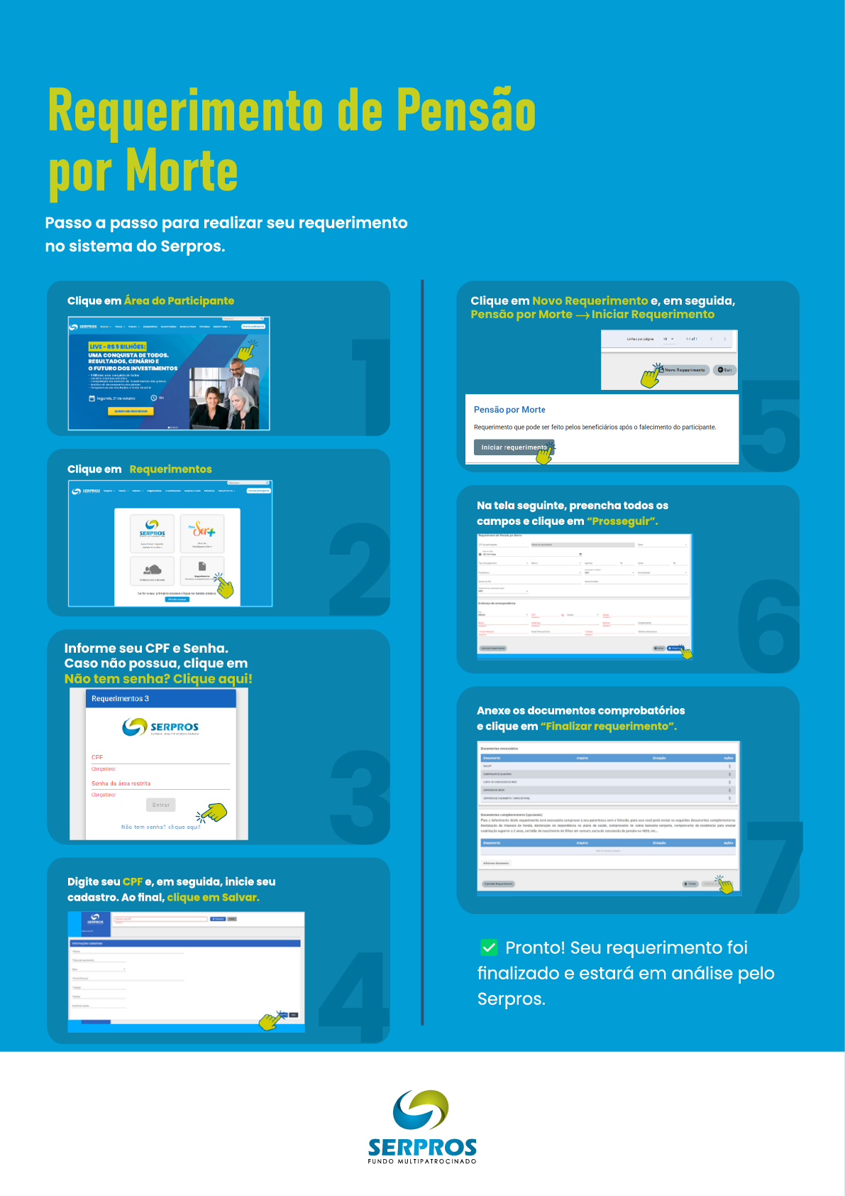 O Serpros disponibilizou uma nova funcionalidade que traz mais praticidade, segurança e conforto aos seus pensionistas: o Requerimento de Pensão por Morte agora pode ser realizado de forma autônoma e automatizada diretamente na Área do Participante, no site do Serpros, acessando a seção Requerimentos.