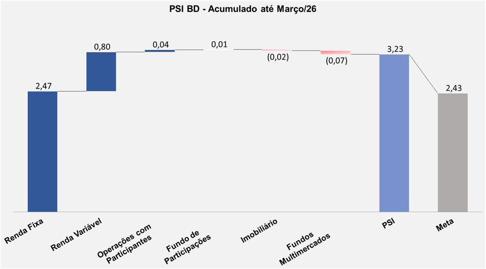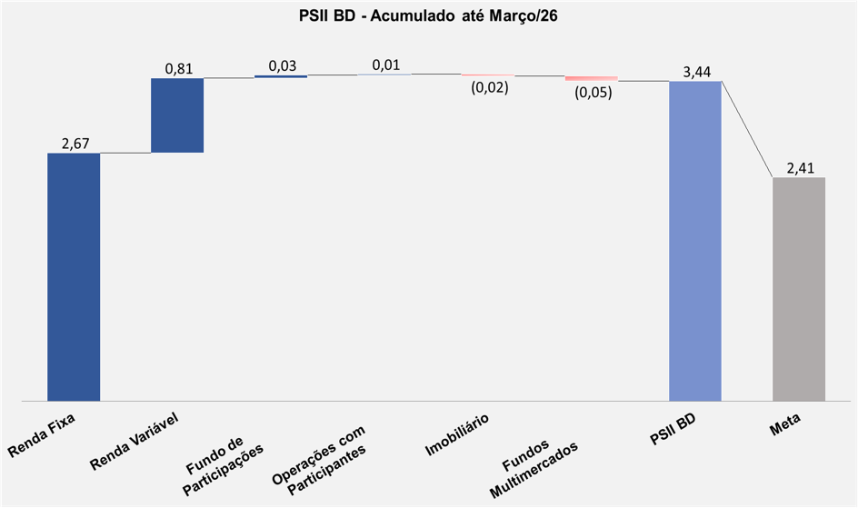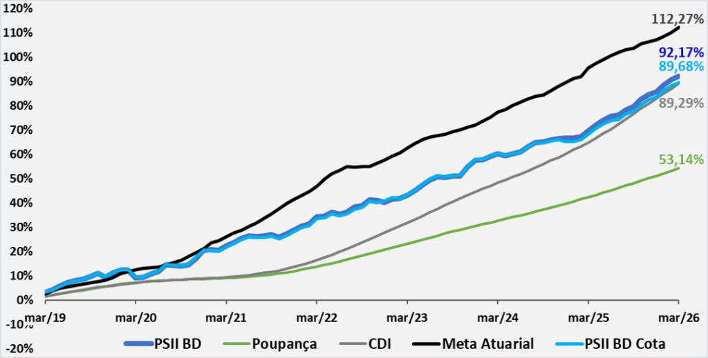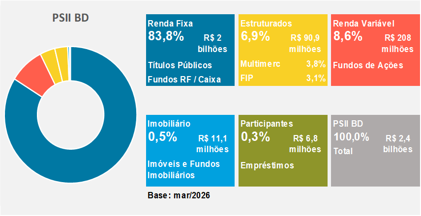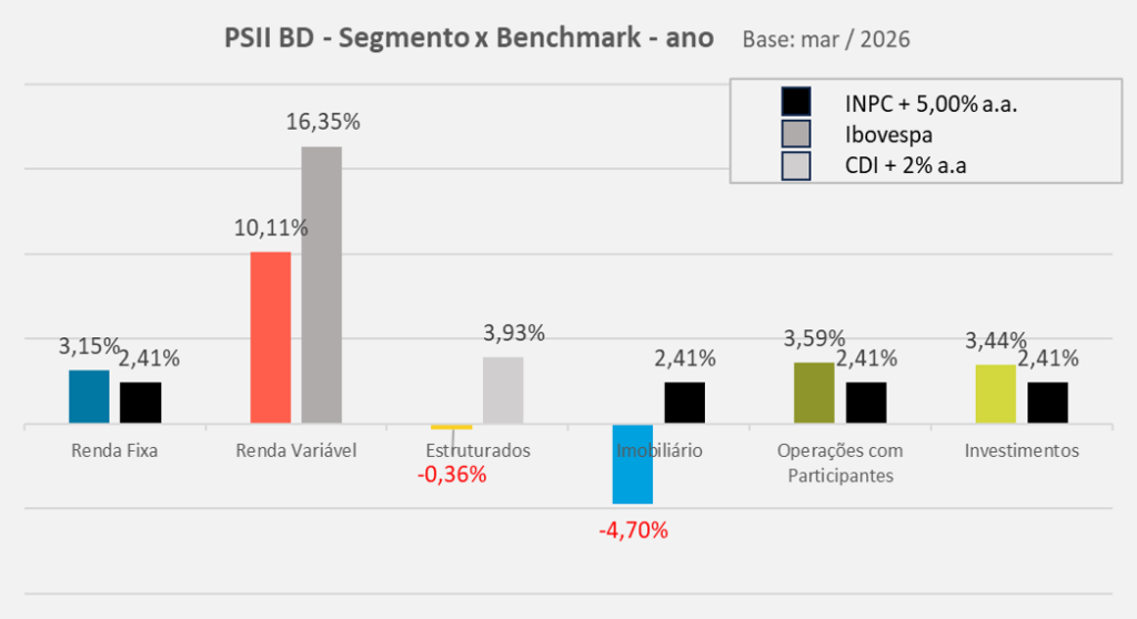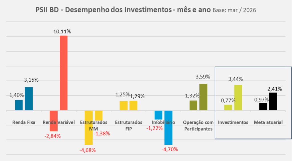 Em março, o plano PSII BD apresentou desempenho equivalente a 80% da meta atuarial. O segmento Renda Fixa, com as posições em títulos públicos indexados à inflação mantidos até o seu vencimento (NTN-B, 78,2% do plano), tiveram contribuição acima da meta atuarial. A correção destes papéis é feita pela inflação e a taxa negociada no momento da compra. A taxa média da carteira de NTN-B é IPCA+6,38% a.a.