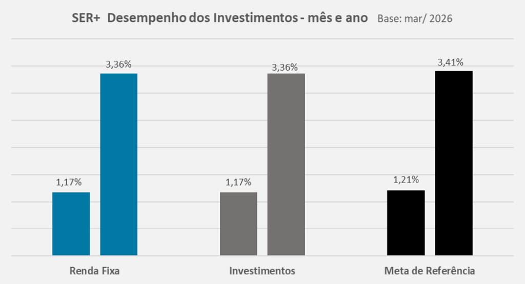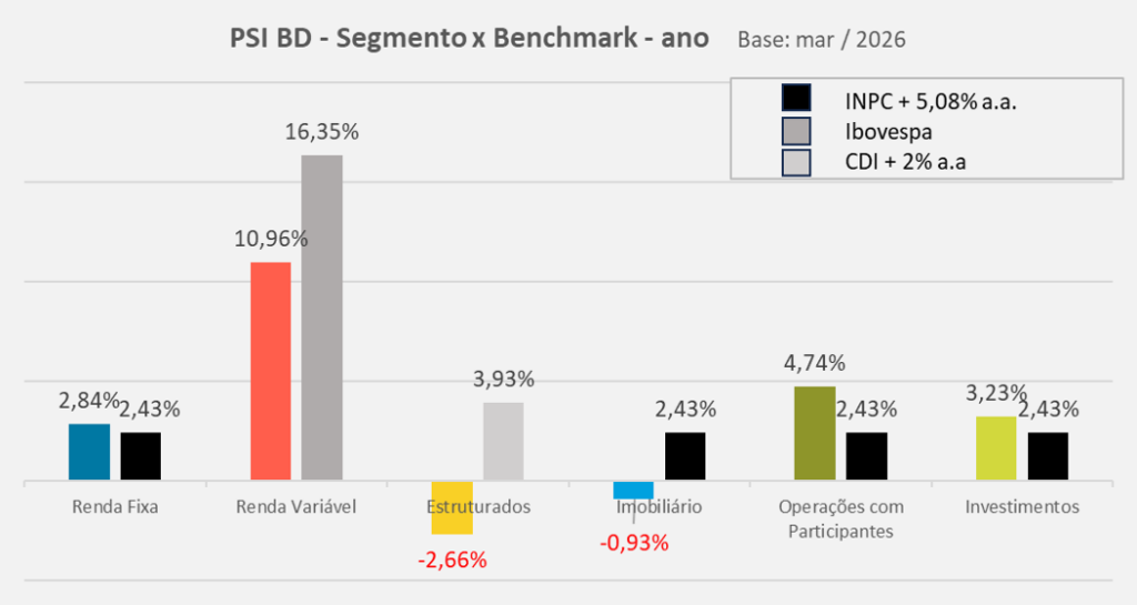No segmento Estruturados (3,7% do plano), os Fundos Multimercados (2,5% do plano) encerraram o mês com contribuição negativa, afetados pela alta dos juros globais e das commodities, em especial do petróleo, em razão do conflito no Oriente Médio; os Fundos de Participações (1,2% do plano) apresentaram contribuição positiva, em função do desempenho de um dos fundos alocados.