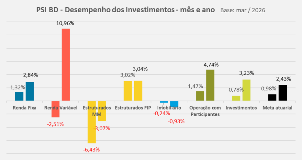 No segmento Estruturados (2,8% do plano), os Fundos Multimercados (2,3% do plano) encerraram o mês com contribuição negativa, afetados pela alta dos juros globais e das commodities, em especial do petróleo, em razão do conflito no Oriente Médio; os Fundos de Participações (0,5% do plano) apresentaram contribuição positiva, em função do desempenho de um dos fundos alocados.