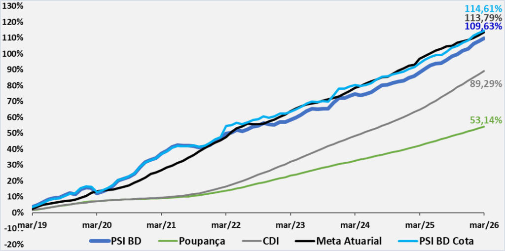 mar/19 – mar26 – nesse período, os investimentos do Plano obtiveram 82% da meta atuarial e 103% do CDI.