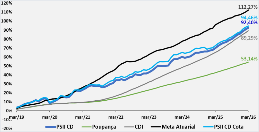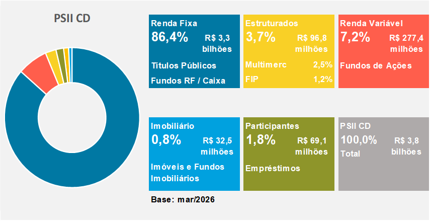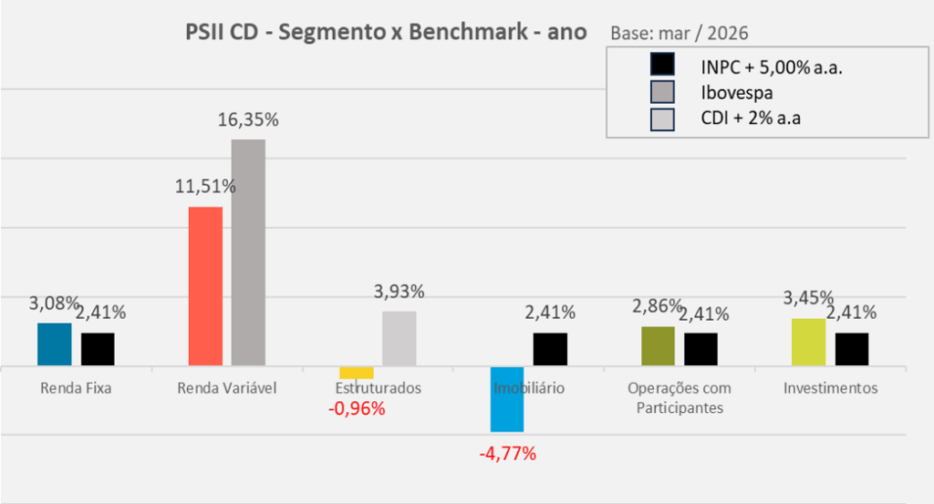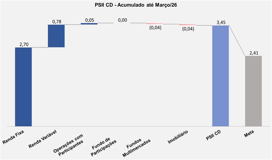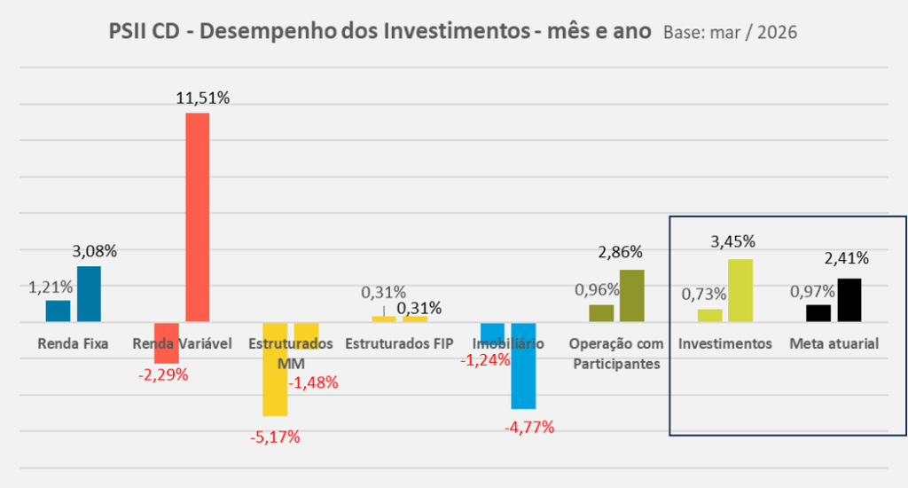 Em março, o plano PSII CD apresentou desempenho equivalente a 75% da meta atuarial. O segmento Renda Fixa, com as posições em títulos públicos indexados à inflação mantidos até o seu vencimento (NTN-B, 57,9% do plano), tiveram contribuição acima da meta atuarial. A correção destes papéis é feita pela inflação e a taxa negociada no momento da compra. A taxa média da carteira de NTN-B é IPCA+6,00% a.a.