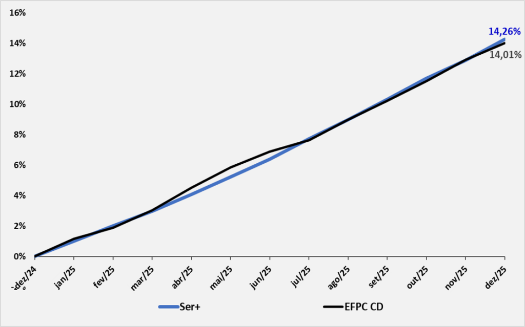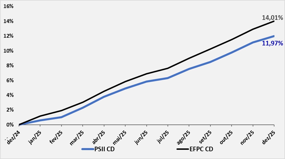 12 meses – comparativo com a média das Entidades Fechadas de Previdência Complementar (EFPC) – planos CD (fonte: ABRAPP – dados disponíveis até dez/25)