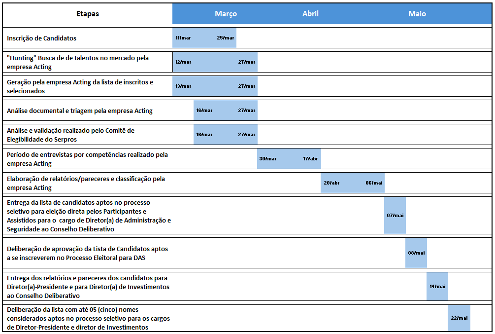 A empresa especializada em recrutamento e seleção de executivos é contratada para prestar apoio técnico ao Conselho Deliberativo na condução das etapas de avaliação da qualificação técnica dos candidatos.